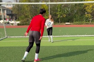 duang~兄弟这射门射得好射得准,一脚踢中了女足的屁股