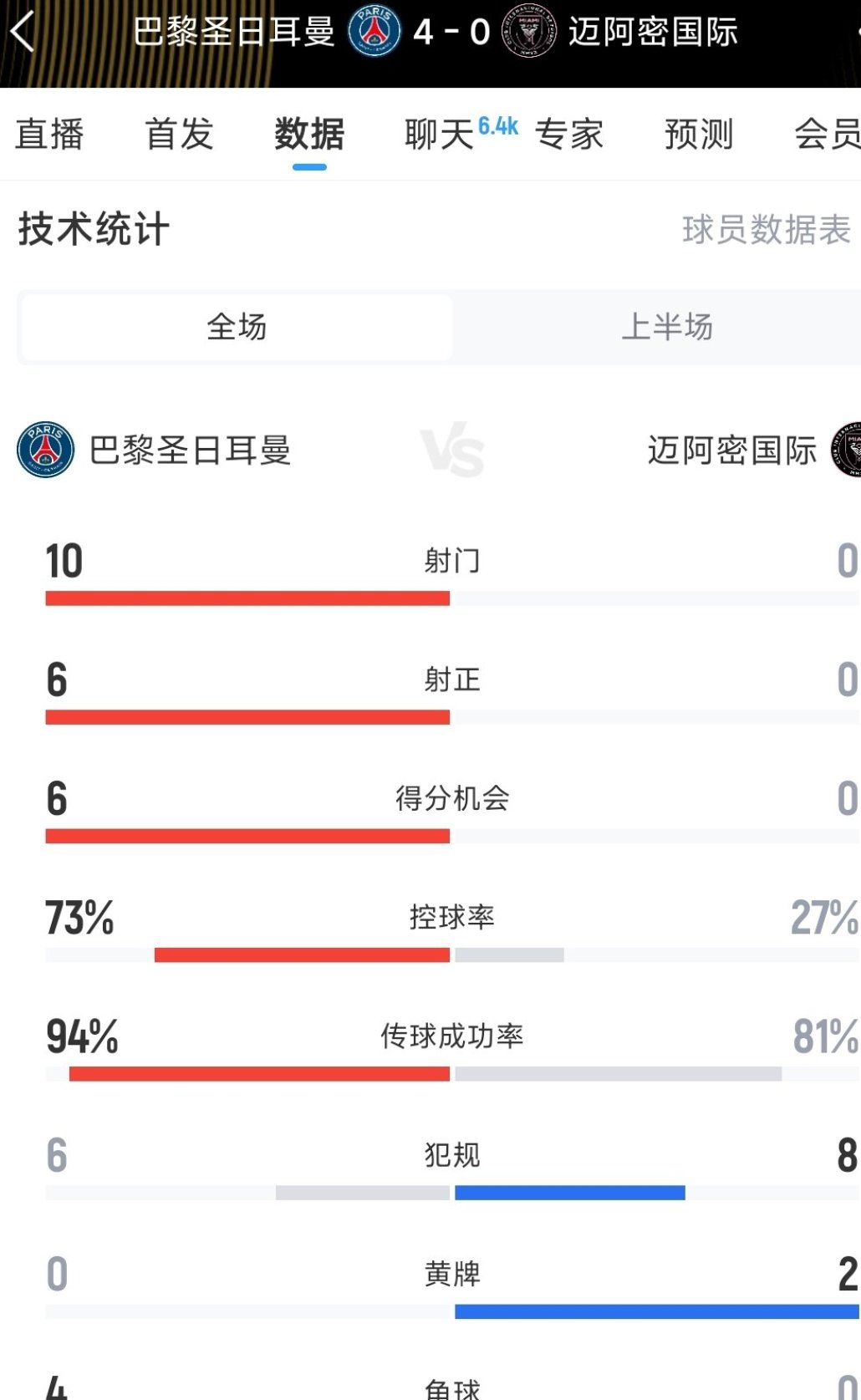 差距太大!巴黎4-0迈阿密半场数据:控球率73%-27%,射门10-0!