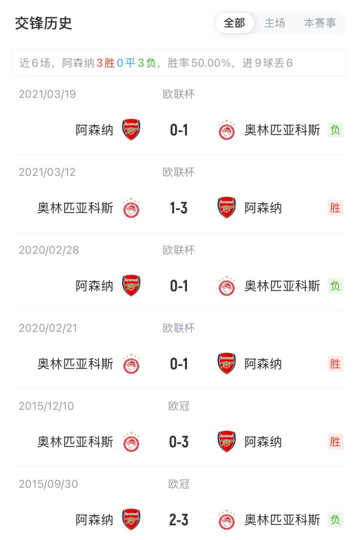 阿森纳首轮2-0客胜毕尔巴鄂,奥林匹亚科斯0-0战平帕福斯。阿森纳与奥林匹亚科斯此前在欧战共交手12次,打成6胜6负。两队上一次交手是2020/21赛季欧联杯1/8决赛,阿森纳两回合3-1、0-1淘汰对手。