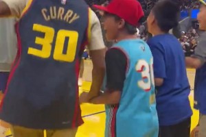 库里和小粉丝击掌!这娃大喊:我再也不洗手了