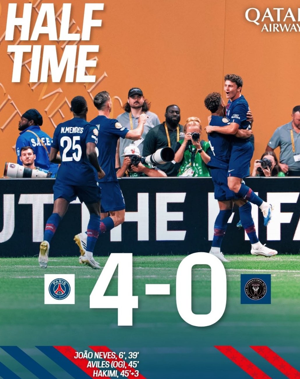 差距太大!巴黎4-0迈阿密半场数据:控球率73%-27%,射门10-0!
